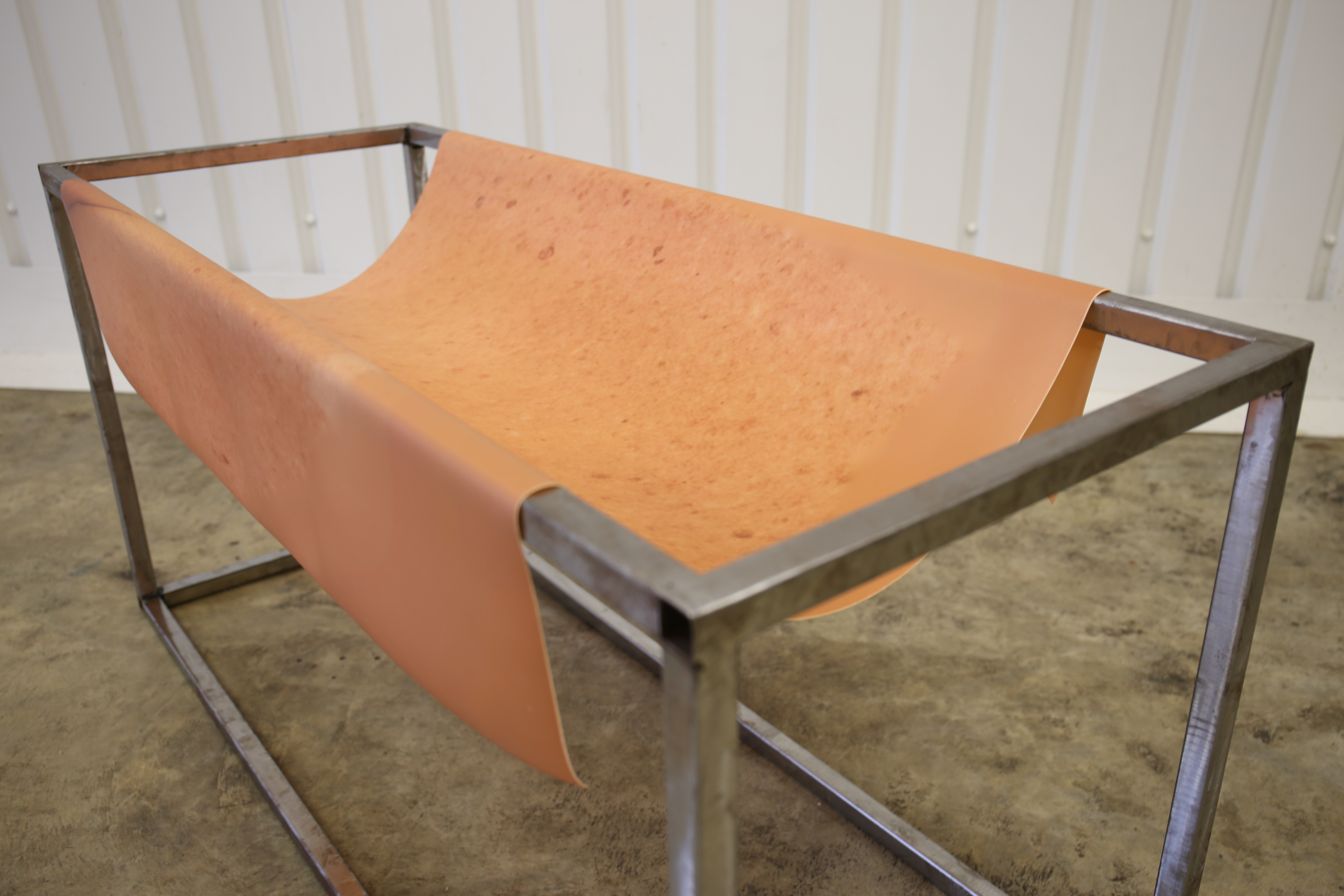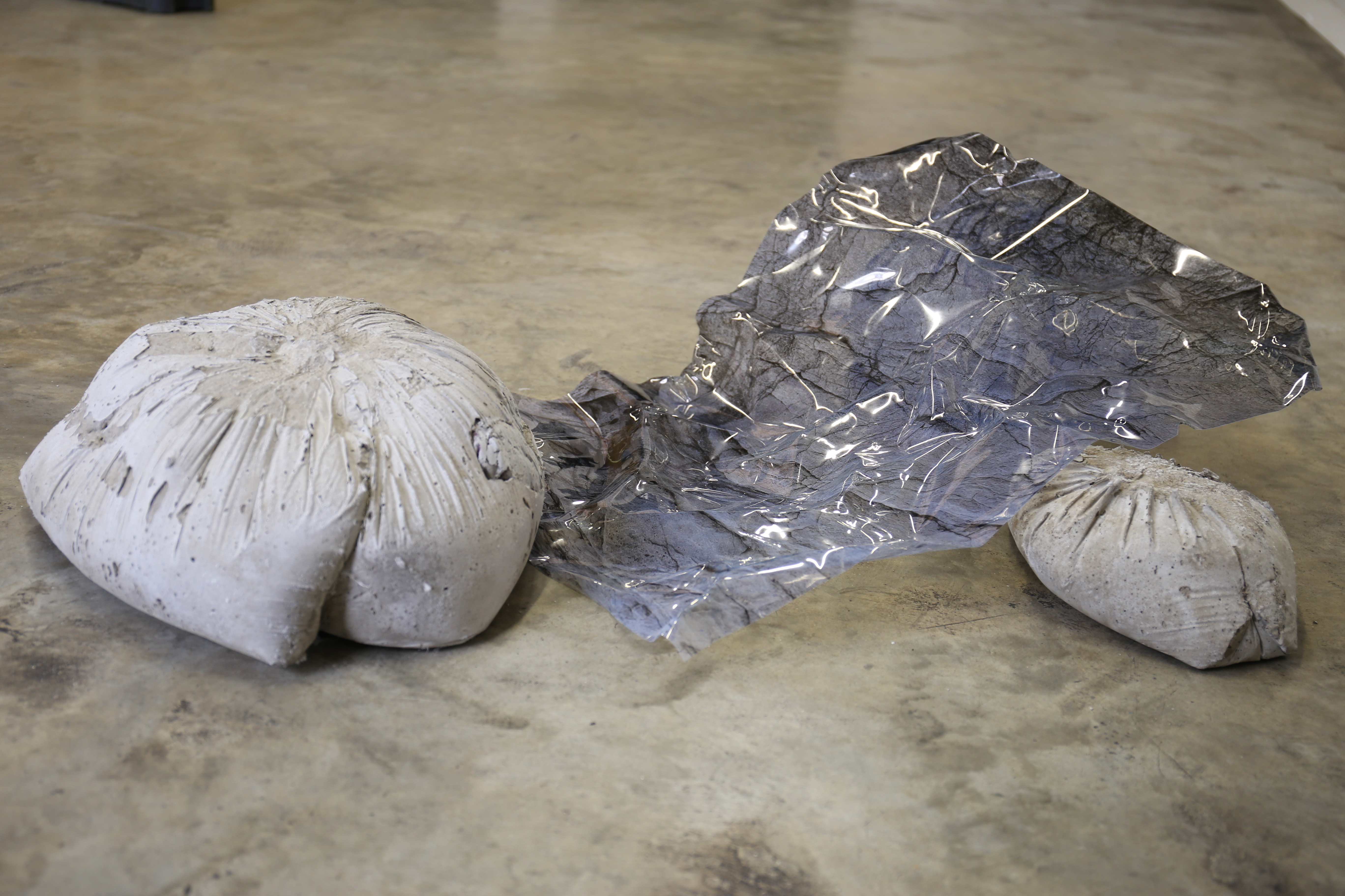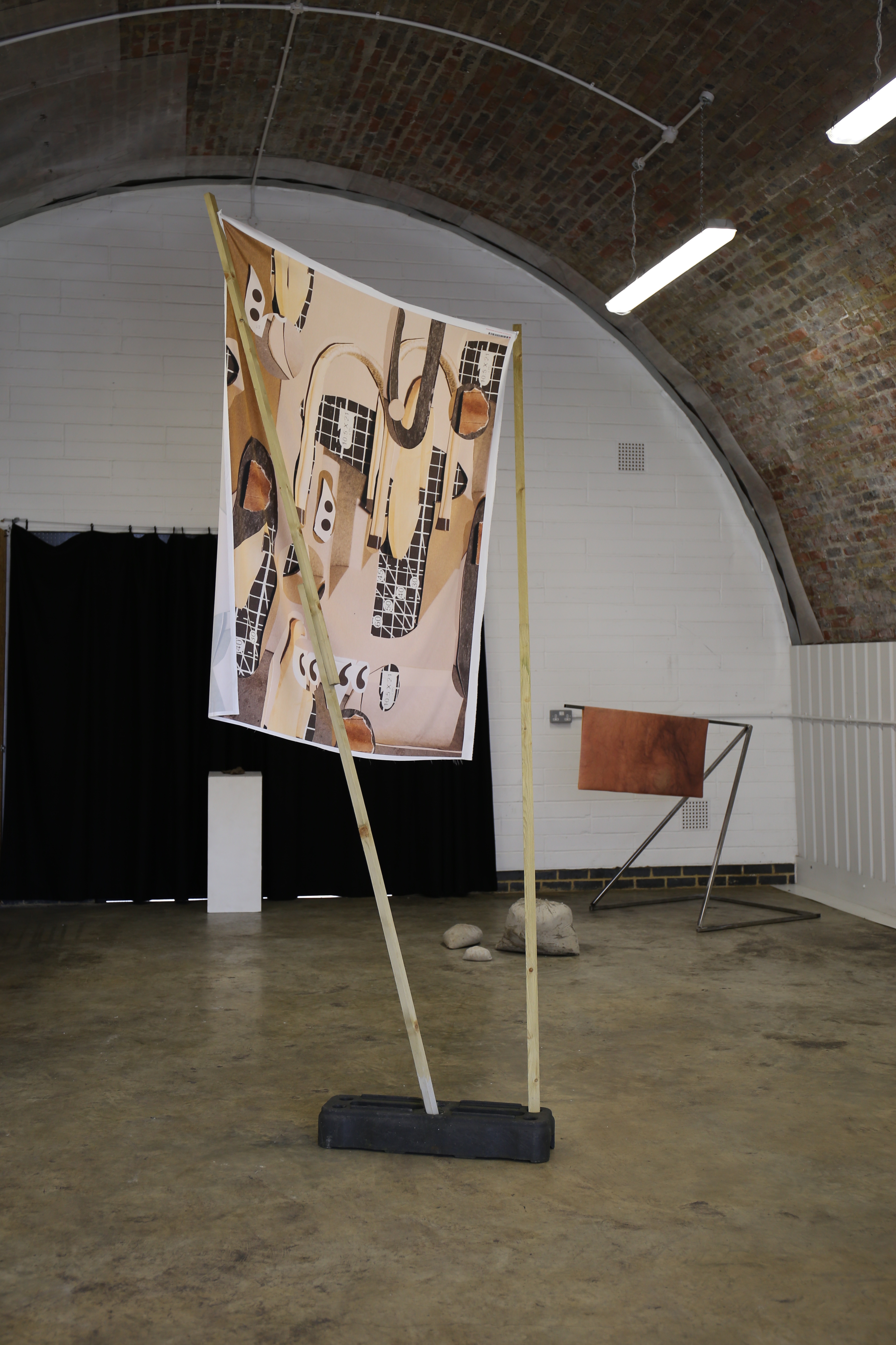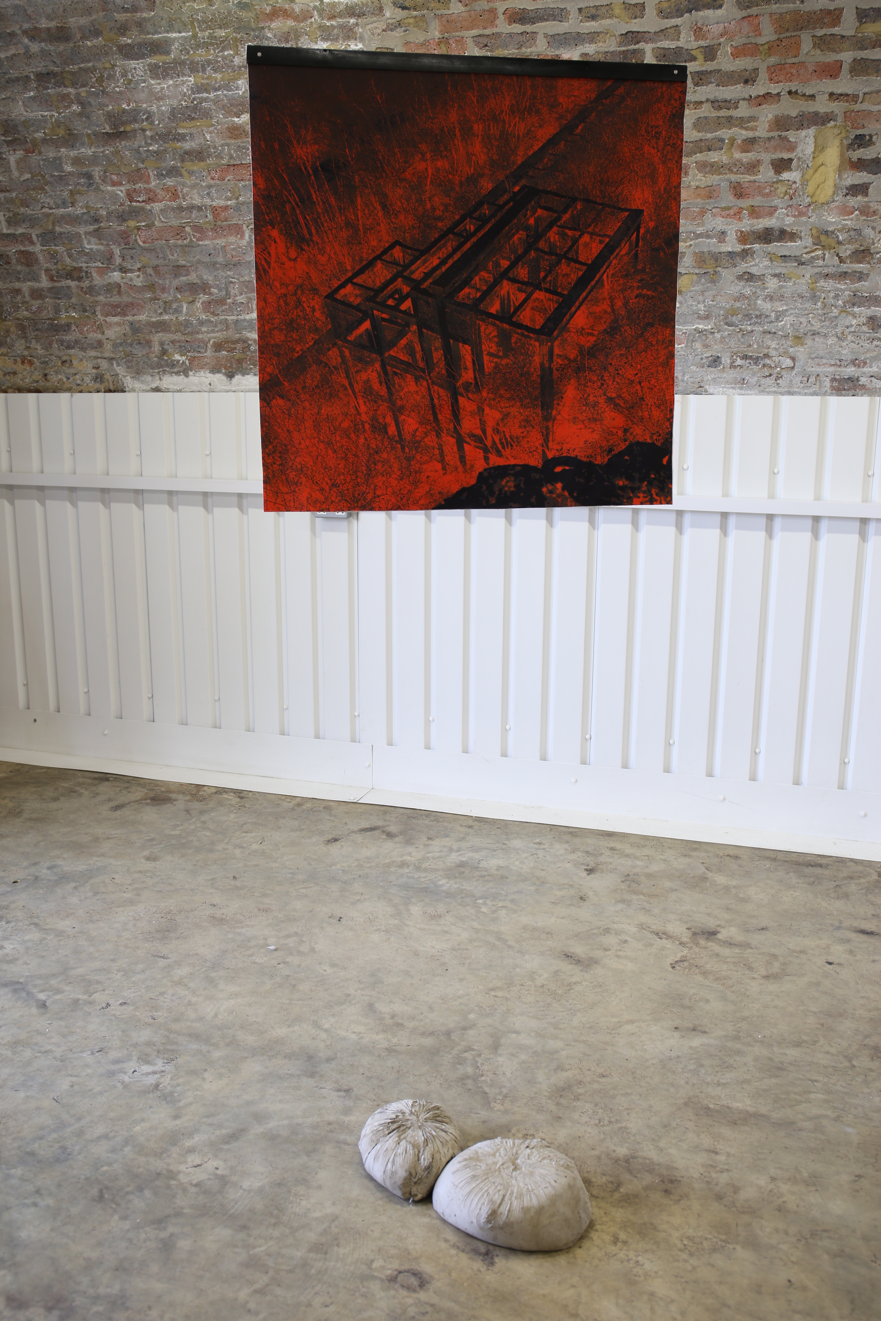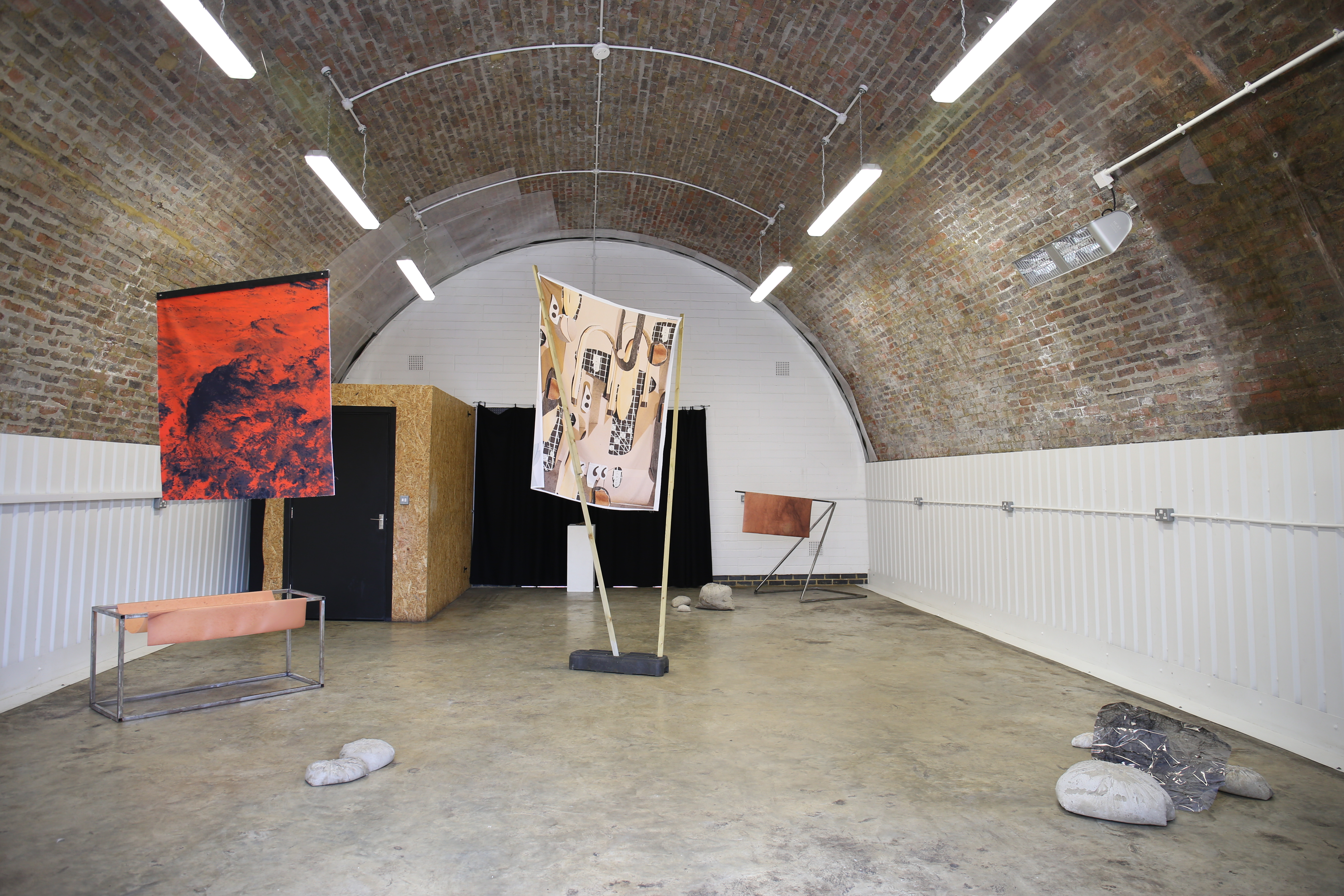 of landscapes which bare little signifiers of prior histories. She alters the colours of these locations to reference an infrared camera and the unspoken trauma carried within Bulgarian society. Furthermore, Gabbelini-Fava uses a two-dimensional surface to distort the human body, giving birth to something new - printed latex allows the skin to unfold to its full length and width, hung across large steel structures. Coexisting are concrete and photographic structures forming a discourse on (re)discovery of personal, inherited and